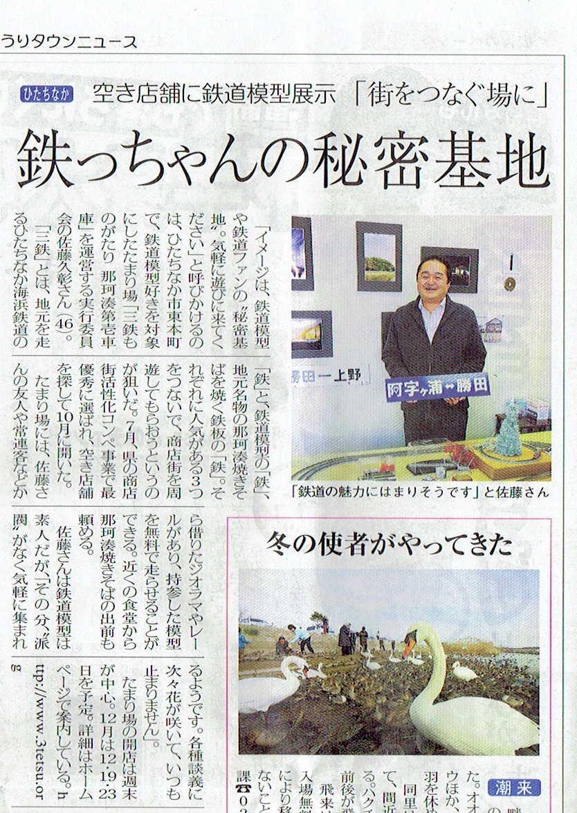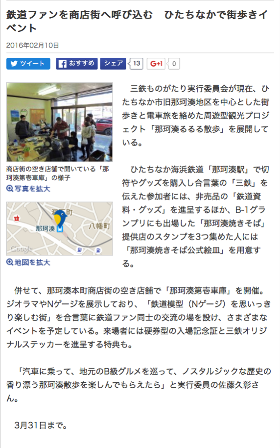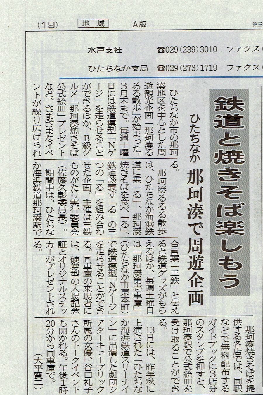 ひたちなか市の那珂湊地区を中心とした周遊観光企画「那珂湊るるる散歩」が始まった。3月末まで。毎週土曜日には鉄道模型「Nゲージ」を走らせることができるほか、B級グルメ「那珂湊焼きそば公式絵皿」プレゼントなど、さまざまなイベントが繰り広げられる。